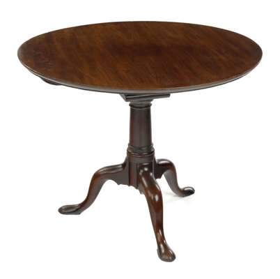 the circular top on bird cage action and turned column with three downswept cabriole legs with pad feet