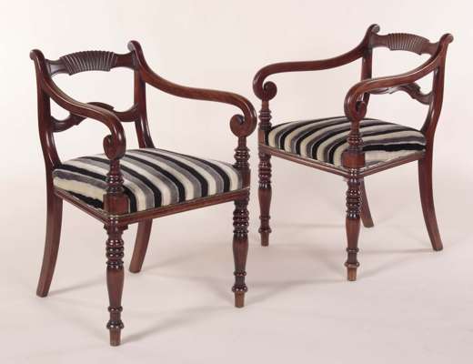 each with gadrooned top-rail over horizontal splat, scrolled arms stuffover seat raised on baluster turned legs (2)