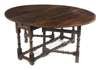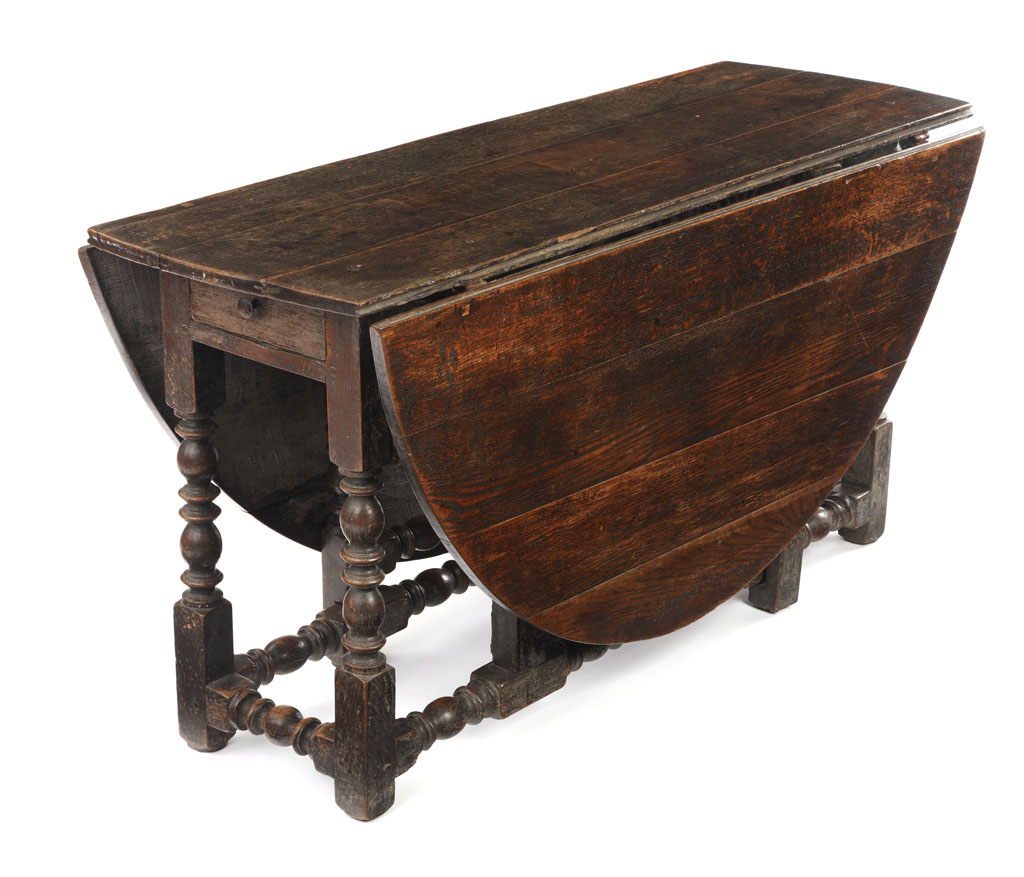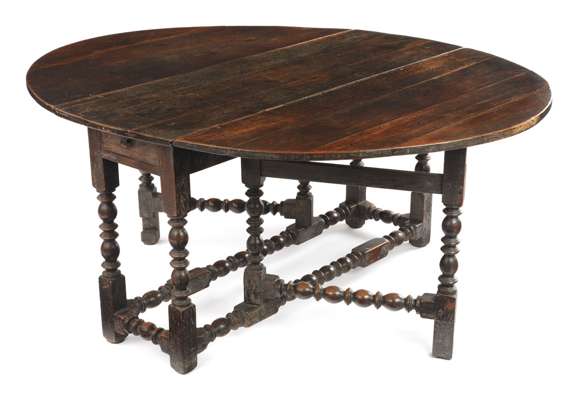 the planked oval hinged twin flap top above frieze drawers to each end, on bobbin and ring turned gate legs joined by similar stretchers, on block feet