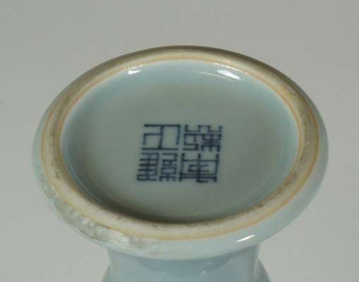 with wide flared rim above slender body with bulb to the stem, blue painted seal mark