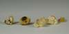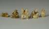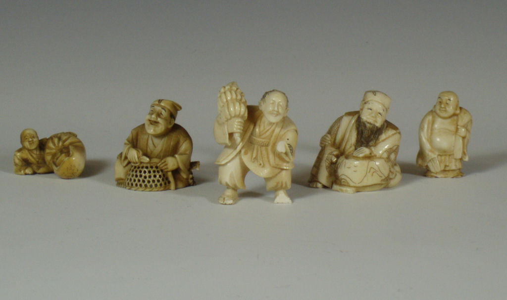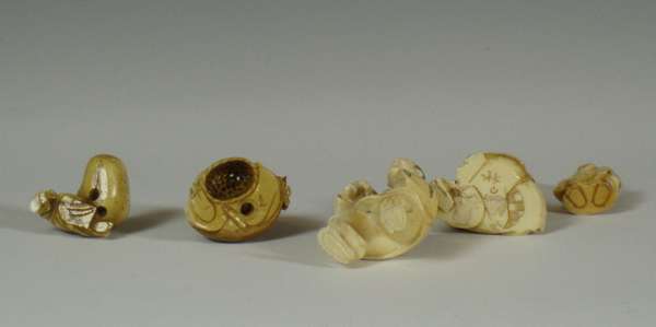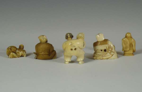 comprising: an old man sitting, character marks to base, 4cm high; a man with a net (damages), character mark to base, 4cm high; a man holding a branch of bananas (damages), 4.5cm high; a man and a baby, 1.5cm high; and a small ivory okimono of a man carrying a sack, 4cm high (5)