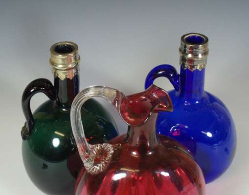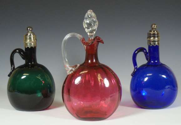comprising: a blue and a green decanter of similar flattened oval form with handle and silver plated stoppers, each 20cm high; and a cranberry decanter, of flattened oval form with twisted glass stopper, 23cm high (3)