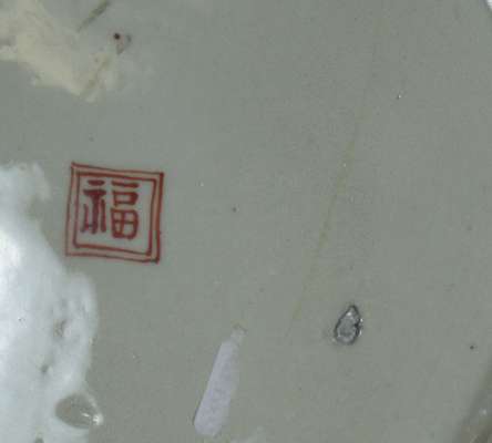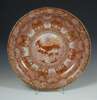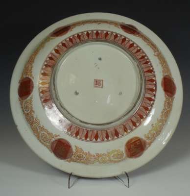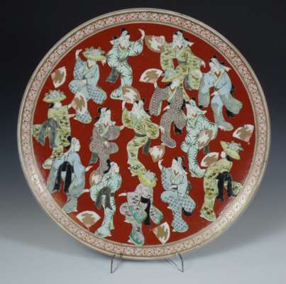 painted in iron red and gilt, seal mark, (repaired) 36cm diameter; and a Japanese porcelain charger decorated with fourteen women in differing attitudes, painted in coloured enamels and gilt on a rust-red ground with patterned border, 41 cm diameter (2)