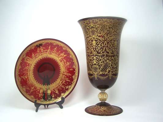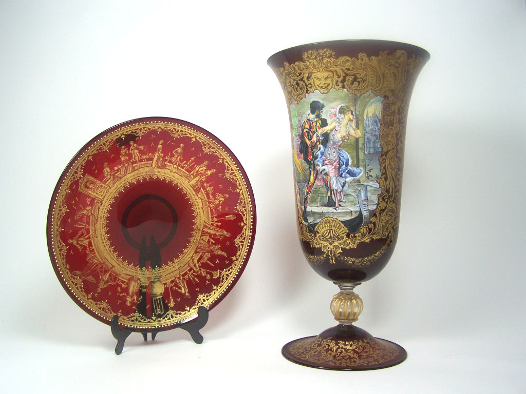 with flared rim above bell shaped bowl on knopped stem and circular foot, decorated with gilt scrolling foliage and swags and with a painted Venetian theatre scene of a man and a woman, 45.5cm high; together with a matched ruby glass stand, with a band of yellow jewelling and a continuous scene of figures in 18th century costume, 34.5cm diameter (2)