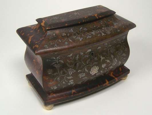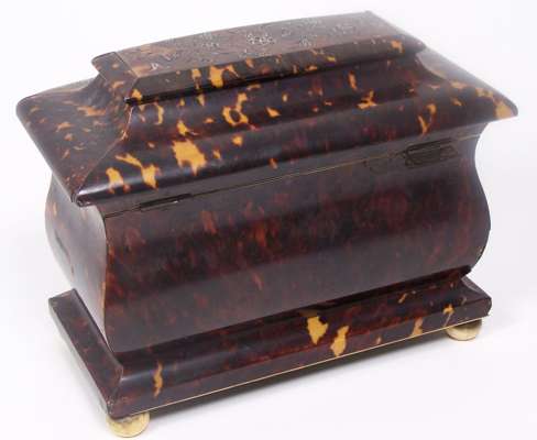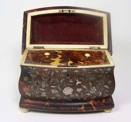 A Victorian tortoiseshell and mother of pearl inlaid bombe tea caddy