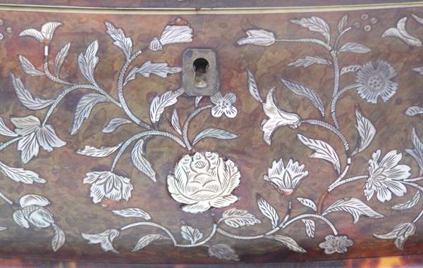 decorated throughout with scrolling foliage, the hinged lid enclosing lidded compartments with turned ivory handles, raised on bun feet