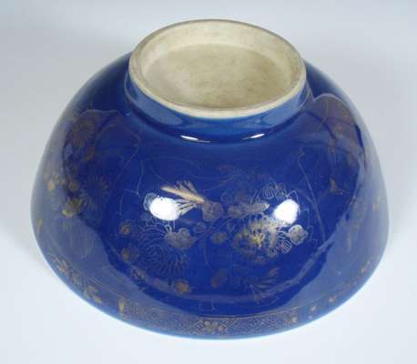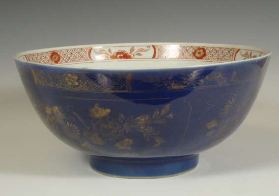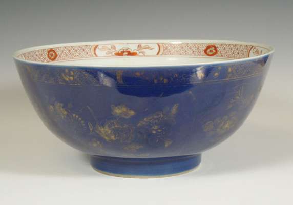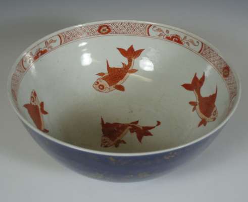 decorated to the well with a floral motif and to the exterior with mandarins, 20cm diameter; and a Japanese porcelain bowl, the well decorated with red carp, the exterior with gilt floral motifs on a blue ground, 27cm diameter (2)