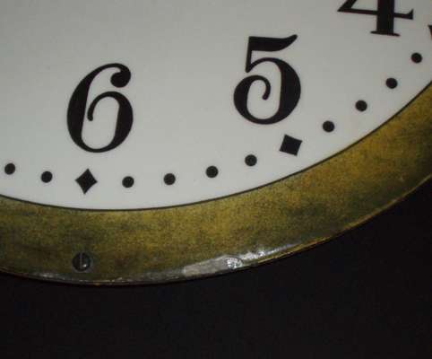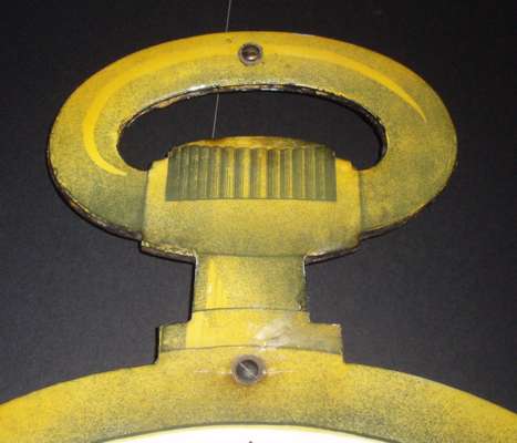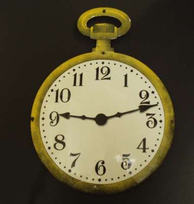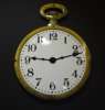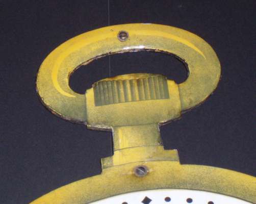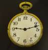 decorated to both sides with a white dial and black Arabic numerals, the yellow case with loop handle