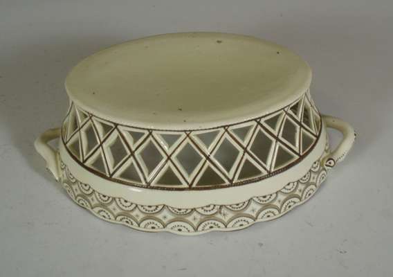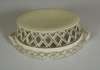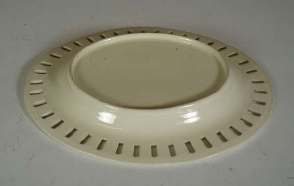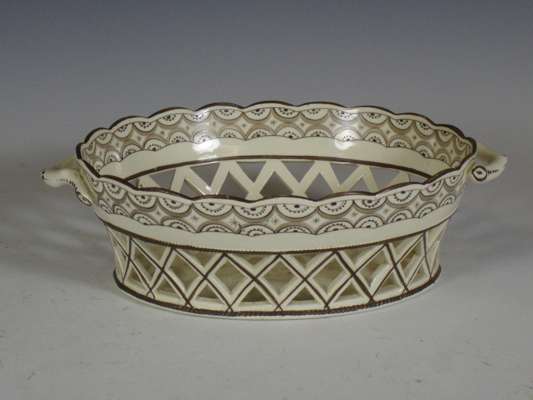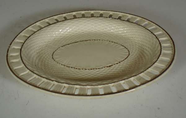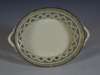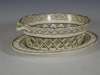 of oval shaped form with reticulated sides and monochrome painted border, 24cm wide; and an oval underplate with reticulated sides and monochrome border, 26cm wide (2)
