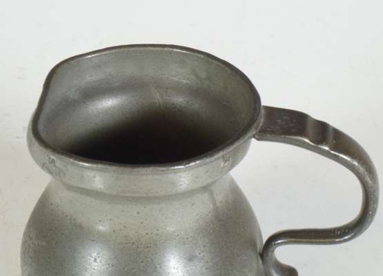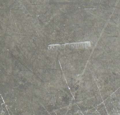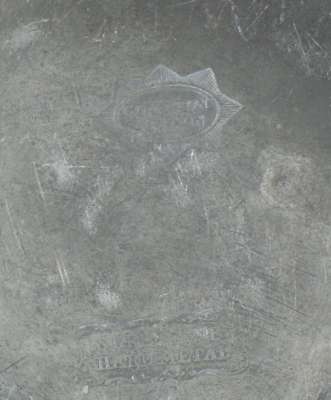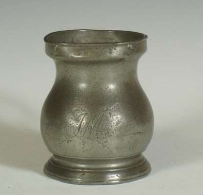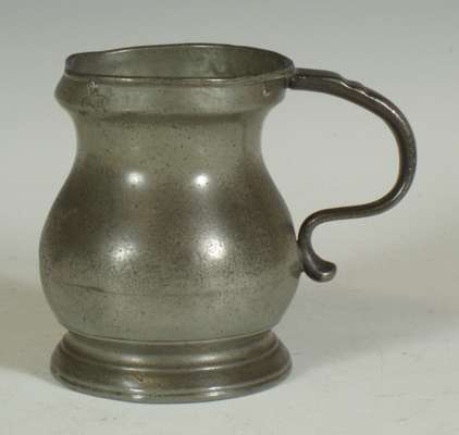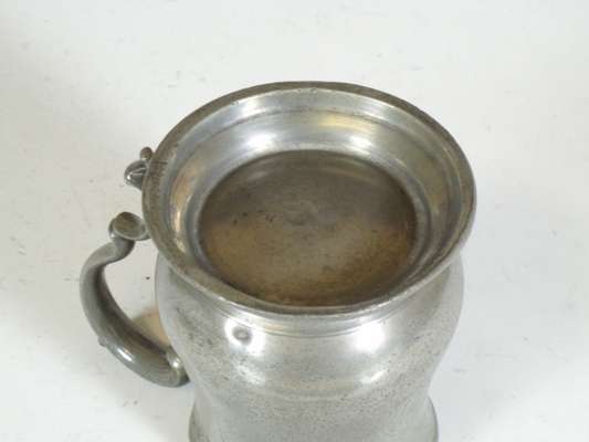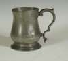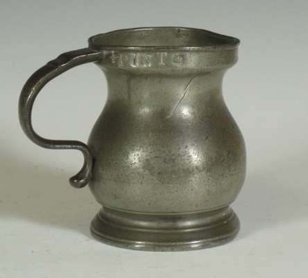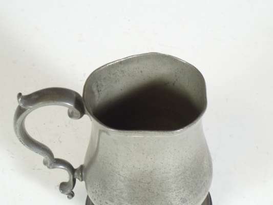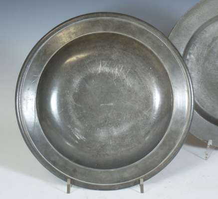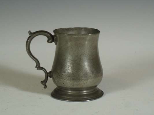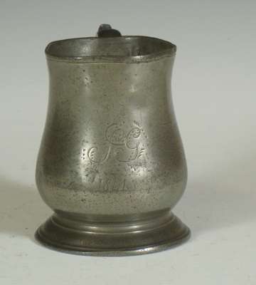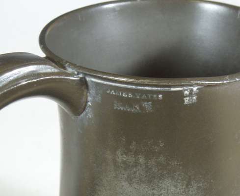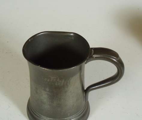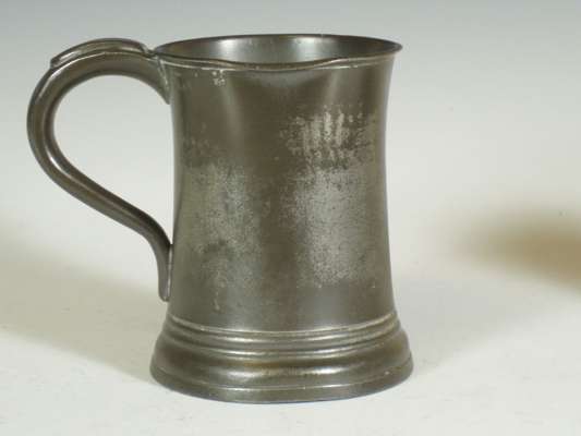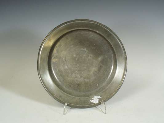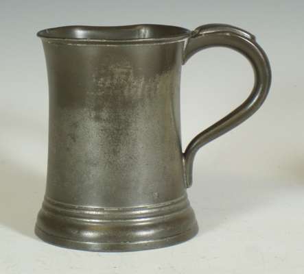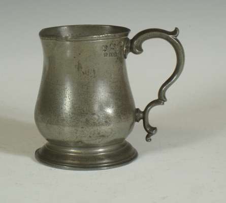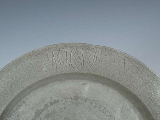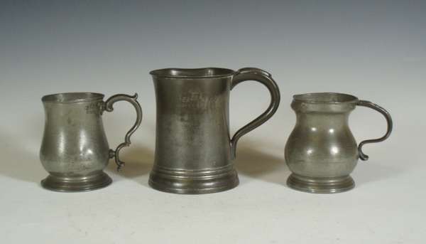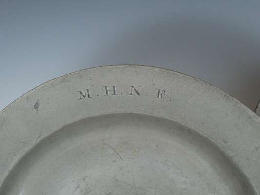 each with initials 'M.H.N.F.' to border, stamped mark 'W.SCOTT', each 24cm diameter; another pewter plate with initials 'M.H.N.F.', stamped mark 'COMPTON LONDON', 24cm diameter; a pint measure and two half pint measures, various marks (9)