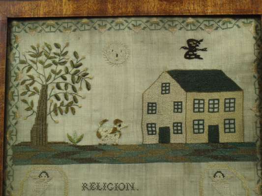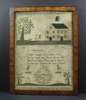 the top section is decorated with a house and garden above a verse panel which is flanked by angels over tree, foliate and bird motifs, the whole contained within a foliate border, in an oak frame