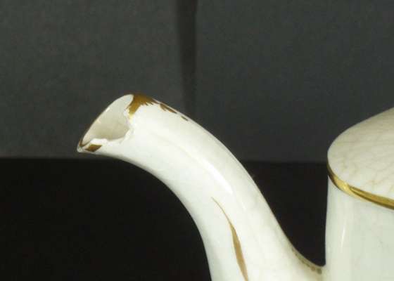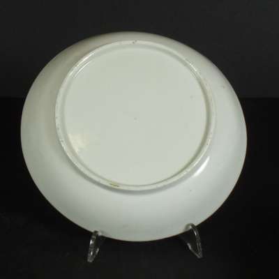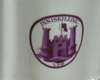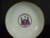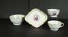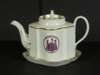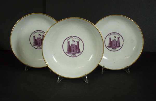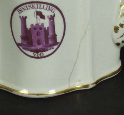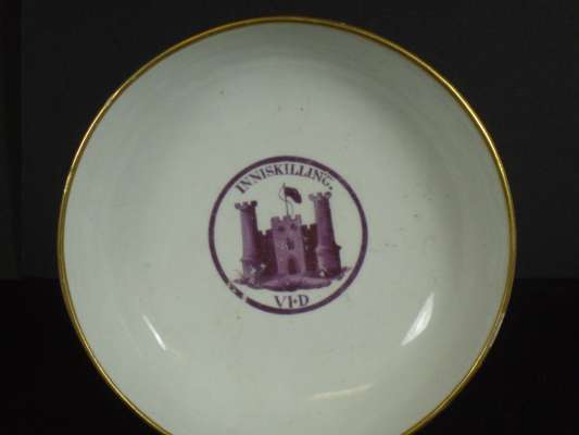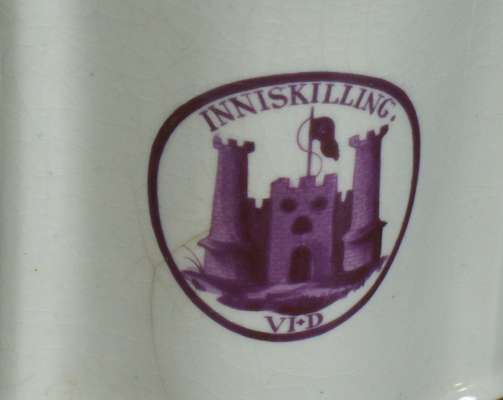 each decorated in purple with a castle and inscription 'Inniskilling VI D', comprising: a teapot, slop bowl and dish, three saucers and two cups (8)