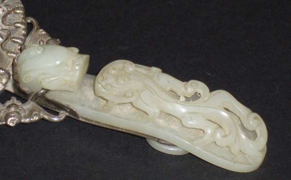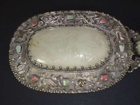 the reverse with carved jade panel surrounded by a white metal border inset with hardstones, the carved jade handle in the form of a dragon