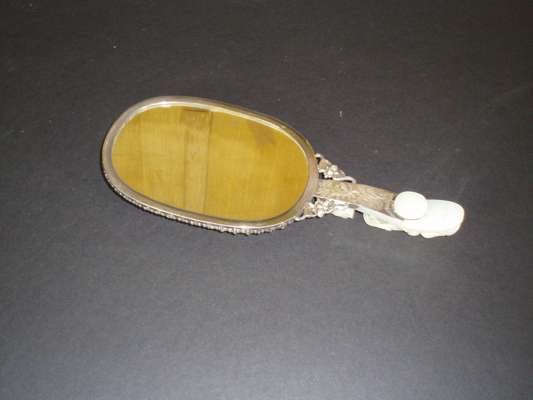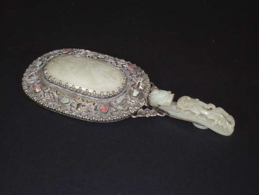 A Chinese white metal and jade hand mirror