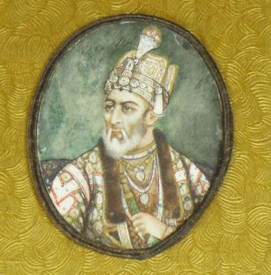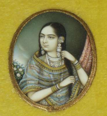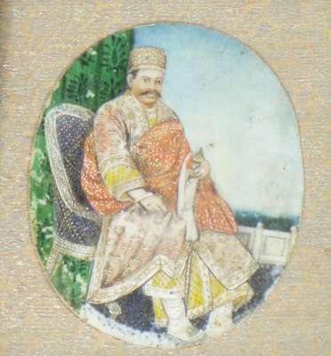 each of oval form, in later frames, depicting: Zeenat Mahal, 6cm x 5cm; Mumtaz Mahal, 6cm x 5cm; Bahadur Shah II, 6cm x 5cm; Shah Jahan, 6cm x 5cm; and another royal figure, 6cm x 5cm; and two other miniatures of noblemen (7)