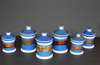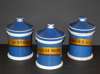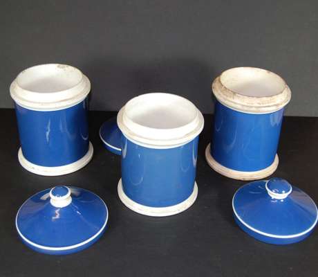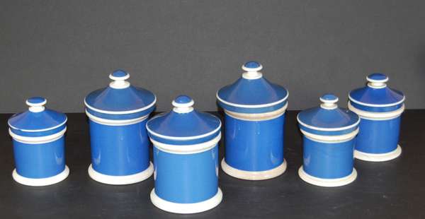 comprising: ten graduated jars and covers decorated with gilt labels on a blue ground; another jar with wooden cover with black printed decoration on a white ground, 13cm high; and an inhaler jar with spout, decorated with black printed decoration on a white ground, 23cm high (12)