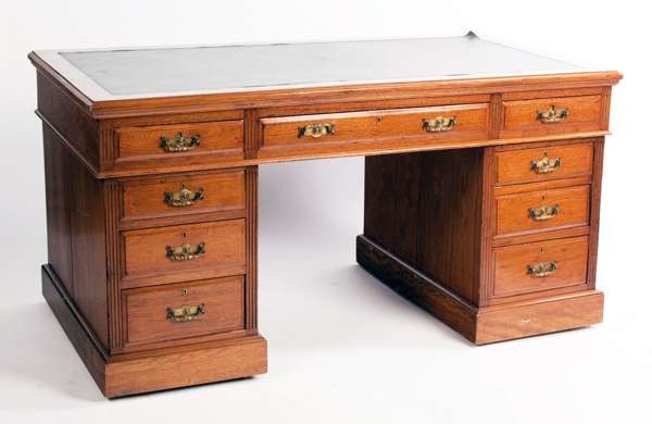 A late 19th century mahogany twin pedestal desk Stamped Maple and Co. Ltd