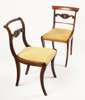each with rope twist top-rail, reeded scroll horizontal splats with brass rosettes, yellow drop-in pad seats, raised on sabre legs; another similar pair of tablet top side chairs; and a carver (5)