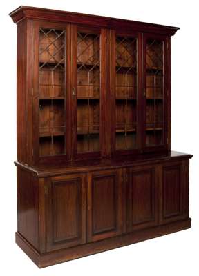 the projected moulded cornice over four astragal glazed doors, enclosing adjustable shelves, four panelled doors raised on plinth base