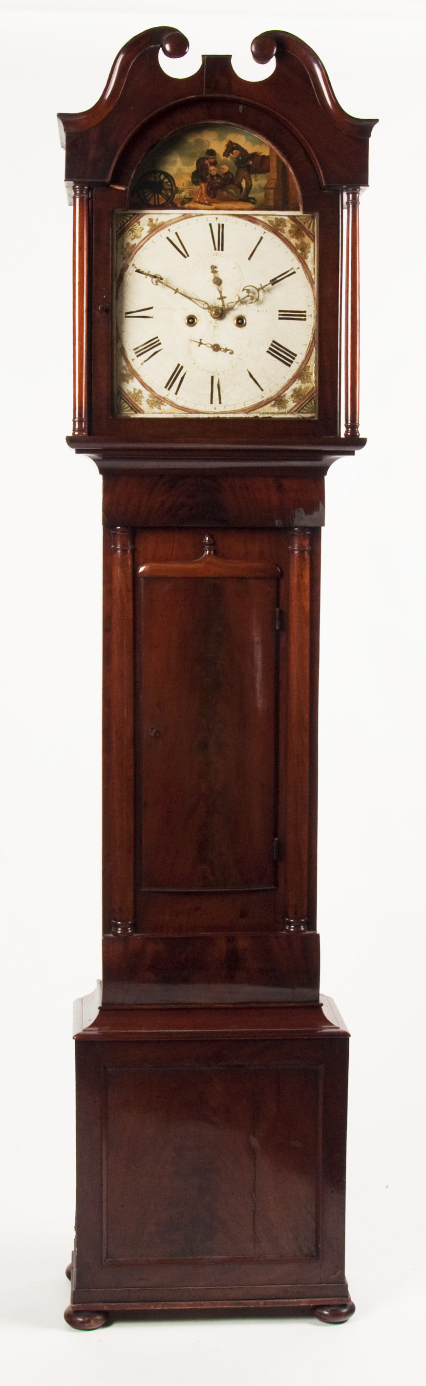 the twin train movement with painted arched face depicting battle scene, subsidiary second and date dials , the hood with swan-neck pediment, over glazed door flanked by columns, the bow front trunk door mounted by pediment with acorn finial, flanked by columns, paneled base raised on bun feet