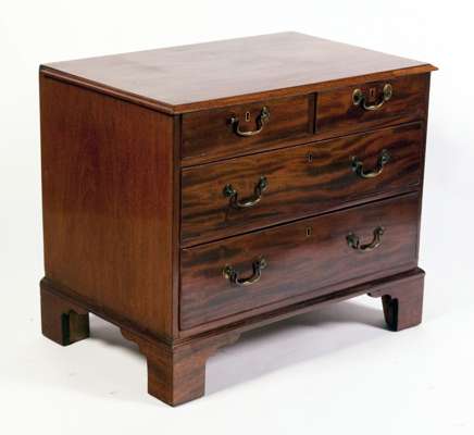 of small proportions, the moulded rectangular top over two short cock beaded and two long drawers raised on bracket feet