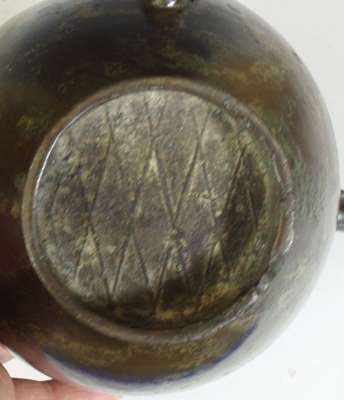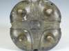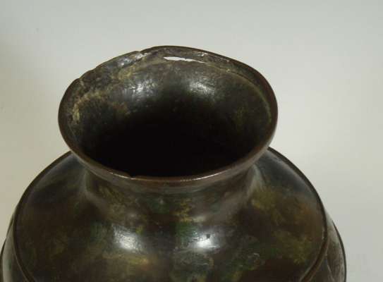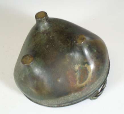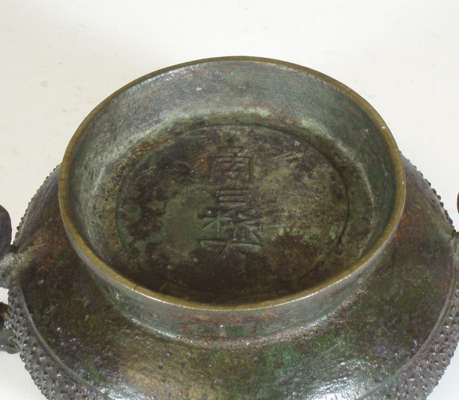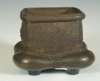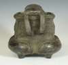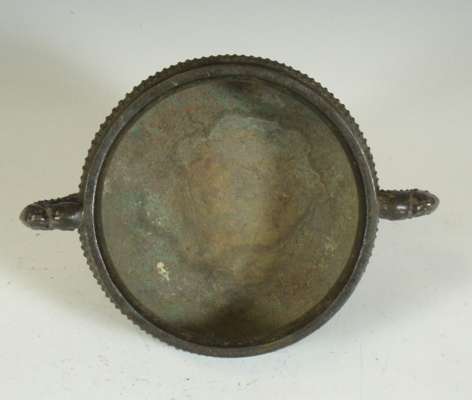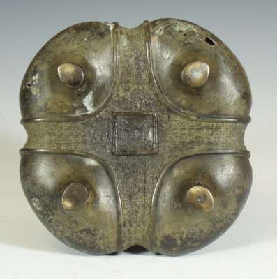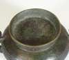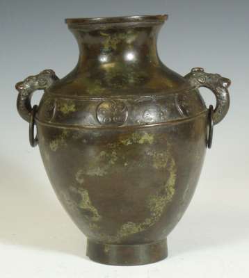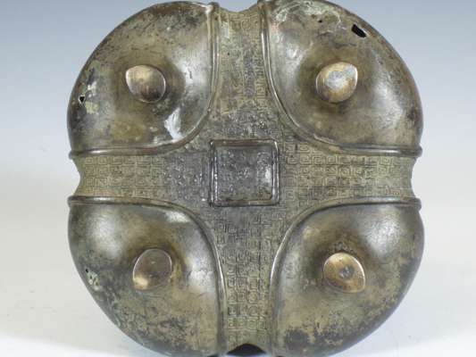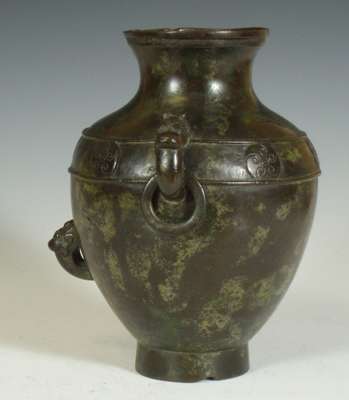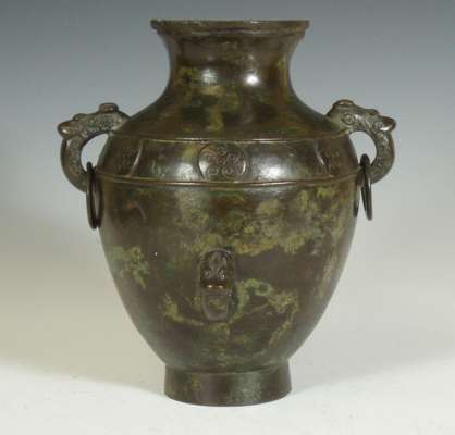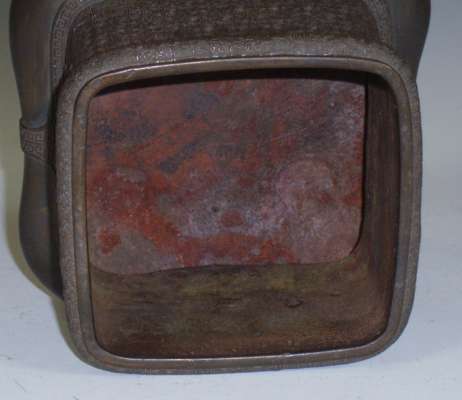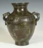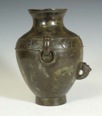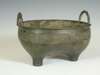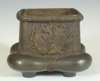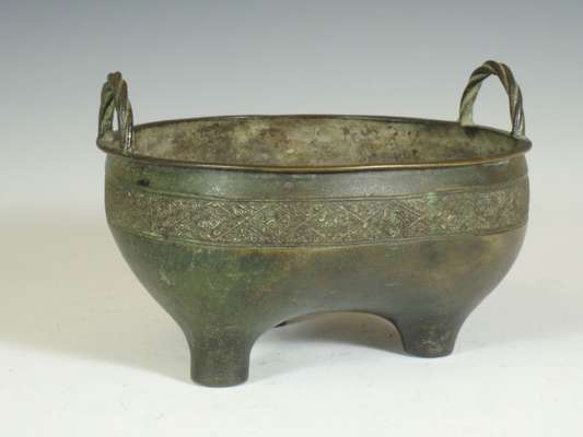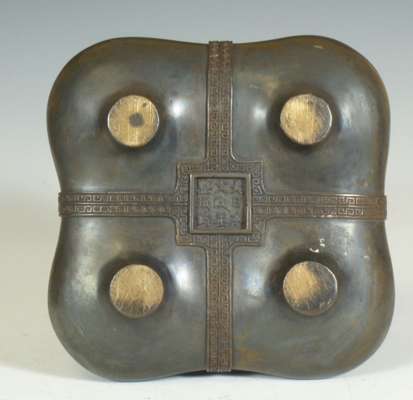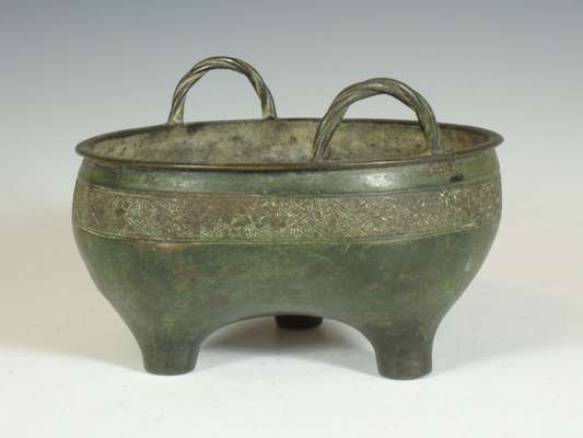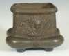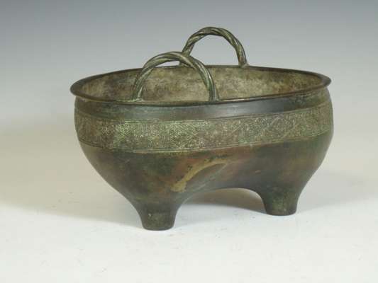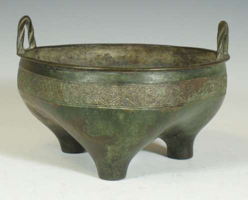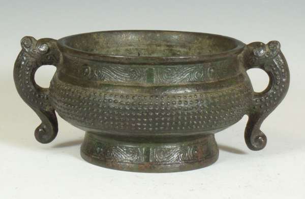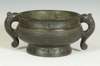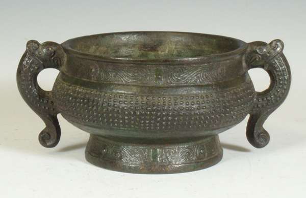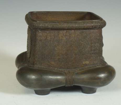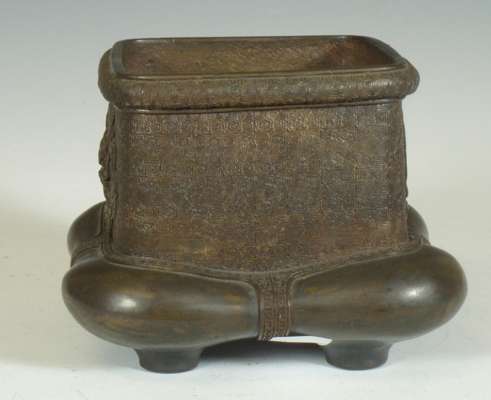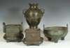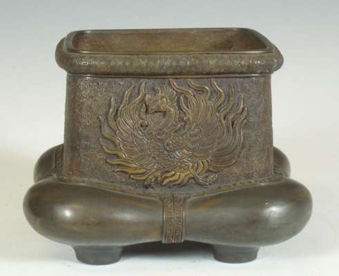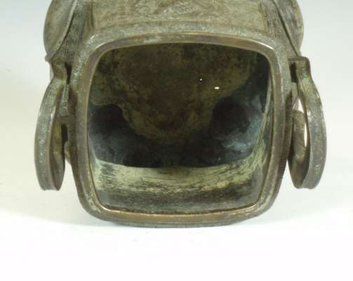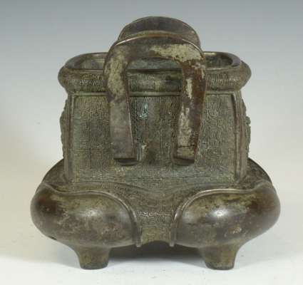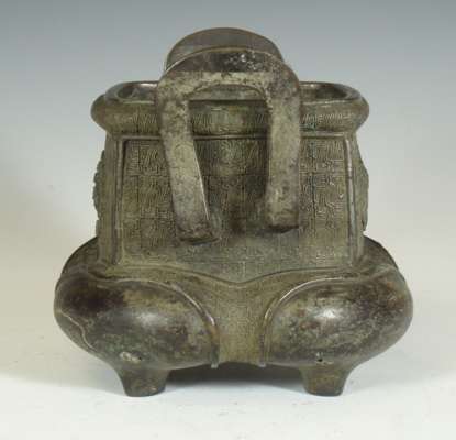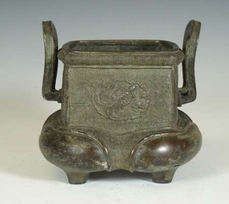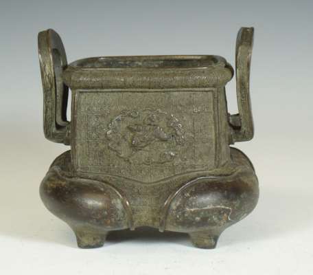 of square form decorated with phoenix and dragon motifs on a geometric ground, standing on four feet, character marks to base, 11cm high; a Chinese twin handled bronze censer, of square form decorated with mythical creatures on a geometric ground, character marks to base, 14.5cm high; a Chinese twin handled vase with ring handles, 20cm high; a Chinese bronze twin handled tripod censer, 13.5cm high; and a Chinese bronze twin handled censer, of shallow ovoid form and with geometric decoration, character marks to base, 8cm high (5)