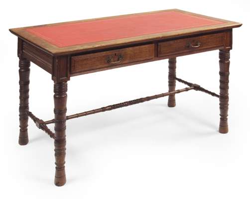 the moulded rectangular top with skiver over two panelled frieze drawers raised on ring turned legs united by H-frame stretchers; including a matched side chair (2)