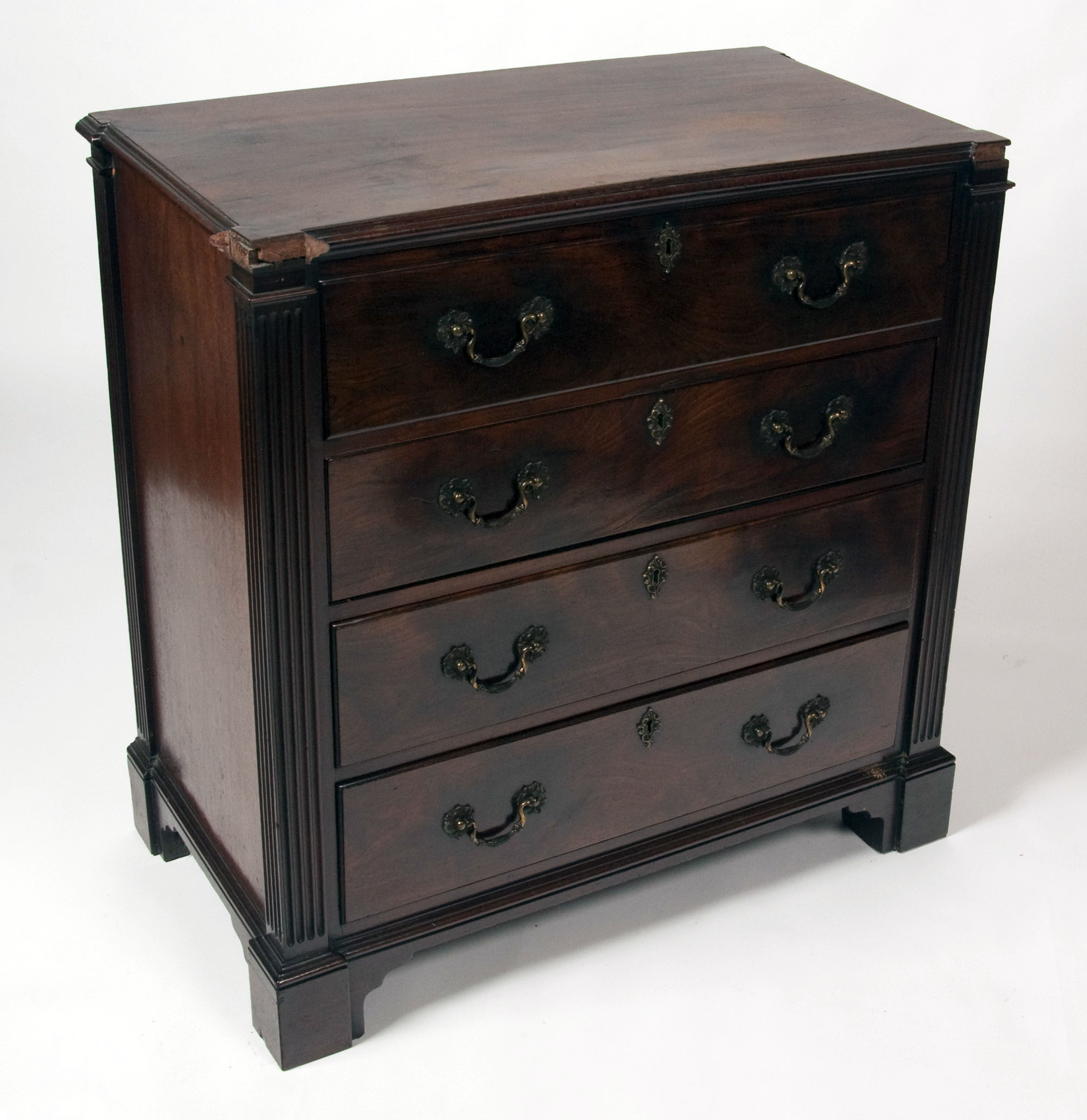 the moulded rectangular top with canted corners, over four moulded graduate drawers, one enclosing fitted interior, flanked by fluted columns, raised on bracket feet