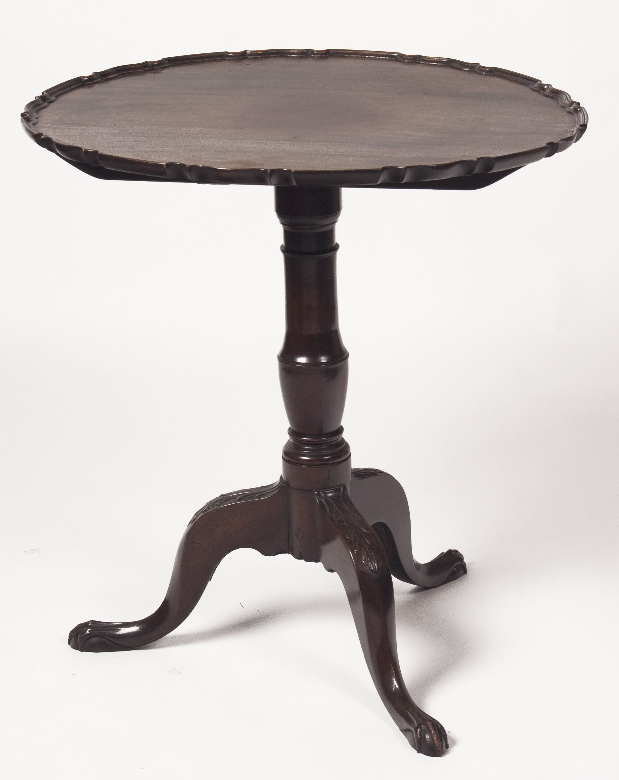 the shaped circular top raised on a vase shaped pedestal, tripod acanthus carved cabriole legs terminating in slender claw and ball feet