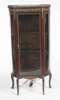 the pierced brass gallery over a pierced brass scroll and swag frieze, glazed door enclosing shelves flanked by glazed side panels, raised on squat legs terminating in paw shaped sabots