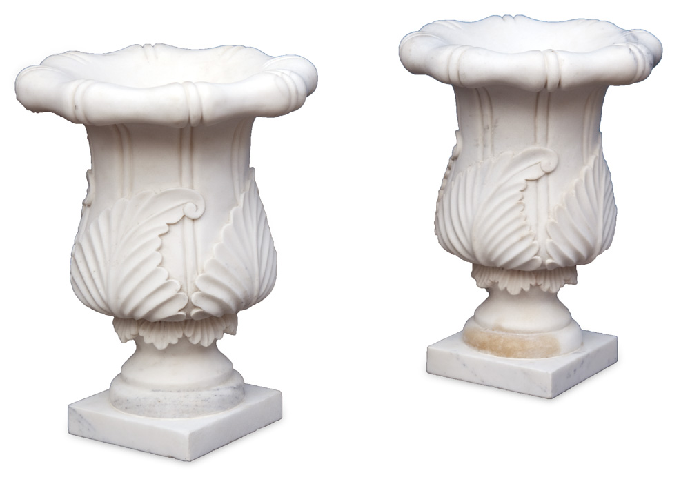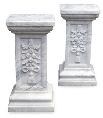 A pair of large modern white and grey marble urns and columns