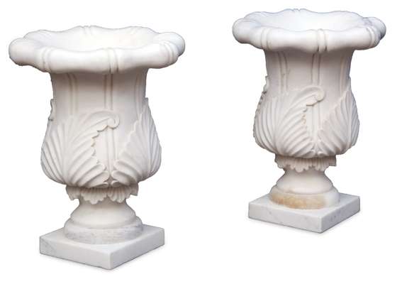 each urn with scrolled lip over acanthus carved body raised on flared squat column, plinth base; each square column with carved panels and tapering plinth base
