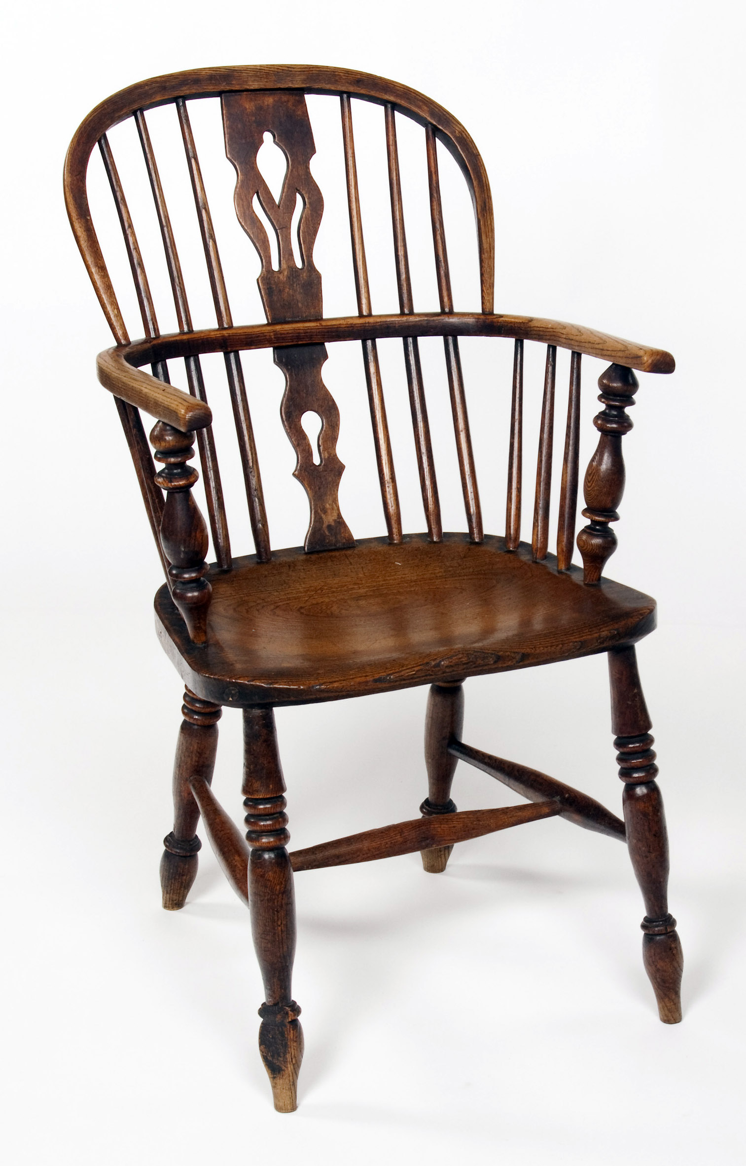the back bow over a vertical pierced vase shaped splat, flanked by spindles, under-arm turnings, shaped seat raised on splayed baluster turned legs united by H-frame stretchers