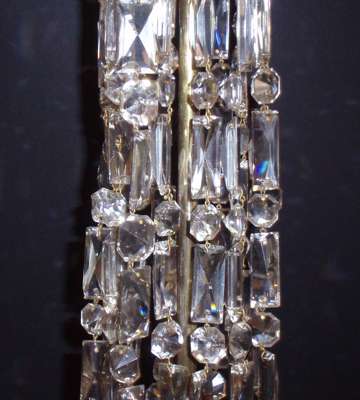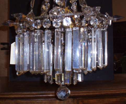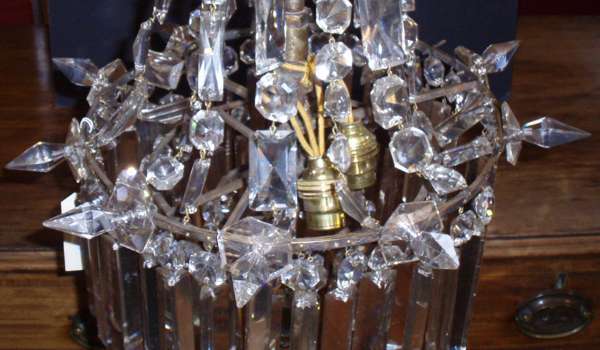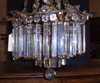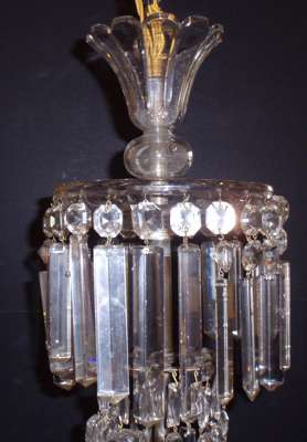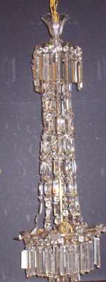 the tall glass and brass support with graduated circles of hanging lustres