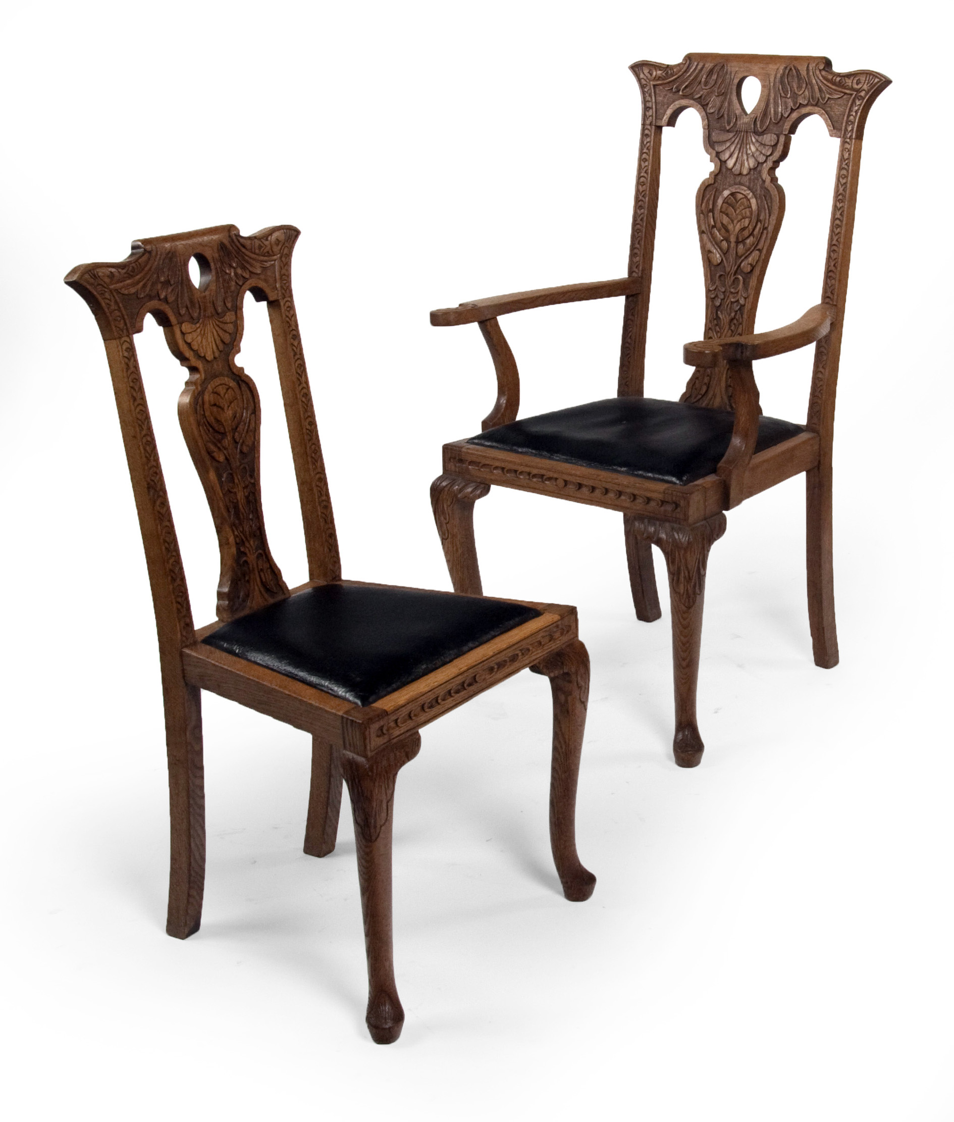 each with stepped top-rail over a carved vase shaped vertical splat, drop-in pad seat, raised on cabriole legs terminating in pad feet; including two carvers (8)