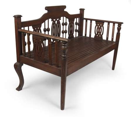 the shaped top-rail over fretwork splats and bobbin turned supports with similar arms over a plain slatted seat with turned front legs and plain cabriole back legs