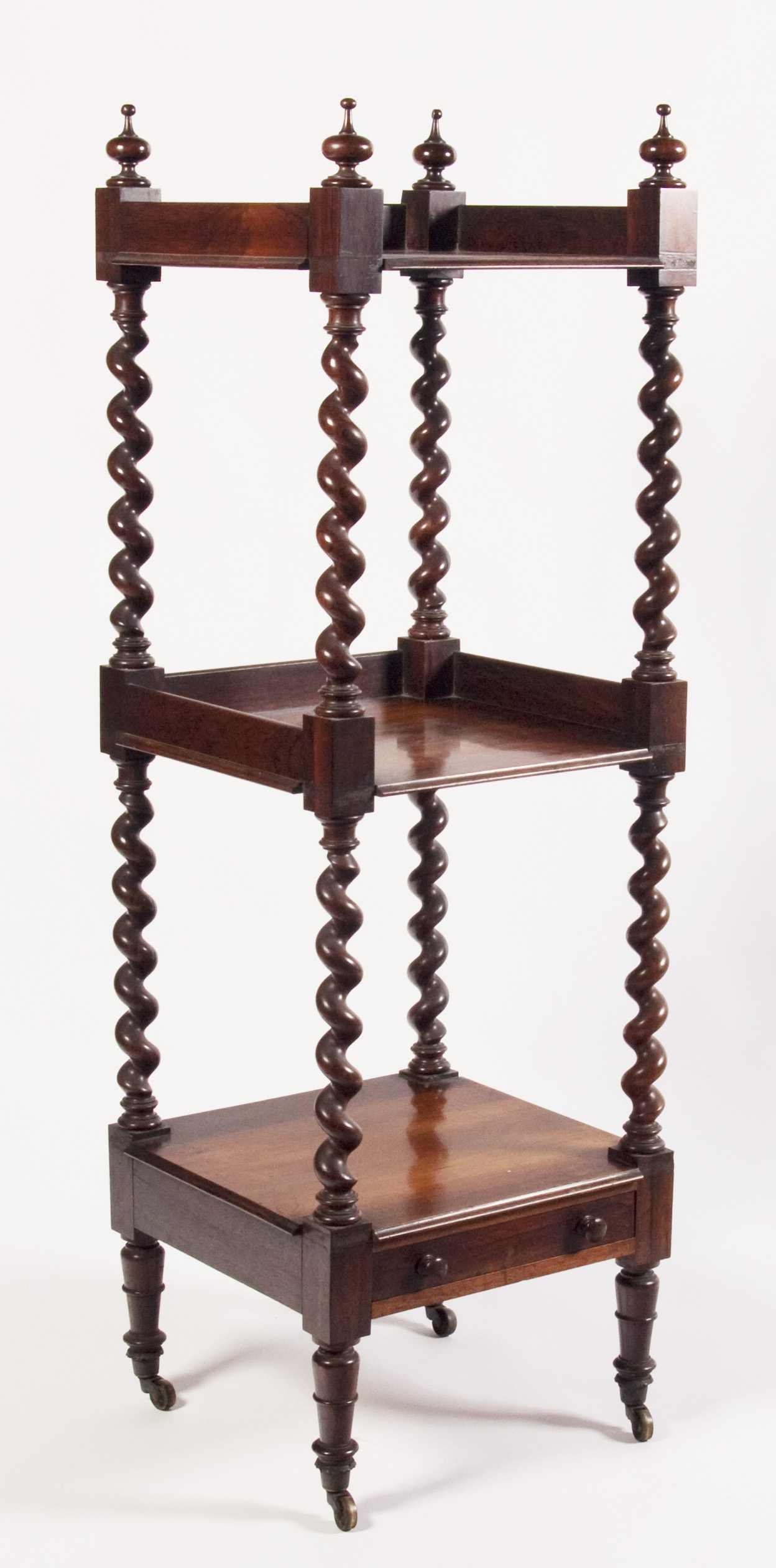 surmounted by bobbin finials above spirally twisted columns, the lower shelf above a single frieze drawer, on turned legs with brass caps and castors