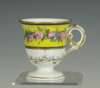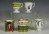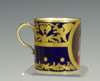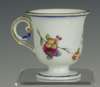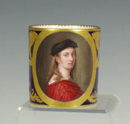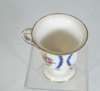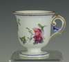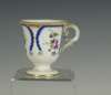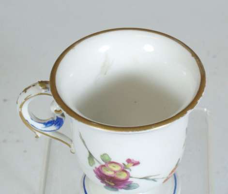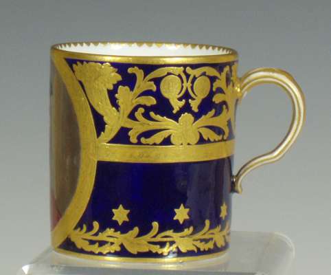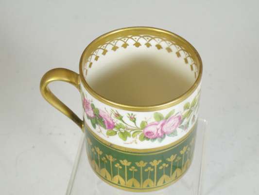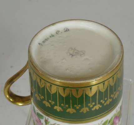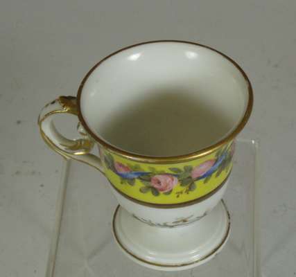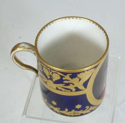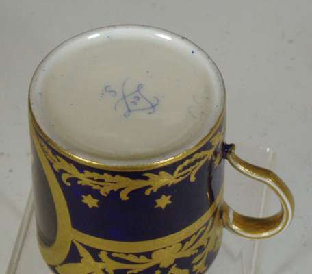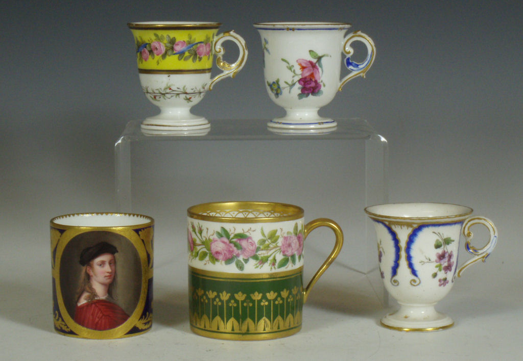 decorated with a portrait of a man reserved on a dark blue ground with gilt frame and gilt scrolling foliage, blue painted crossed L mark and date code for 1780; an early 19th century coffee can, decorated with a border of roses above a dark green band with gilt stylised flowers and foliage, blue printed crossed L mark with fleur-de-lys and dated 9 mai 14 and initialled CD; an 18th century footed coffee cup with flower sprigs between gilt and blue scrolls, blue painted crossed L mark and date code for 1785; another of similar form with simpler decoration, unmarked; and another with a band of roses on a yellow ground above a band of scrolling foliage, blue painted 'Sevres' (5)