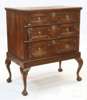 of three long drawers with applied moulding and brass drop handles, the later base section with plain frame and cabriole legs, claw and ball feet