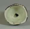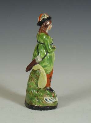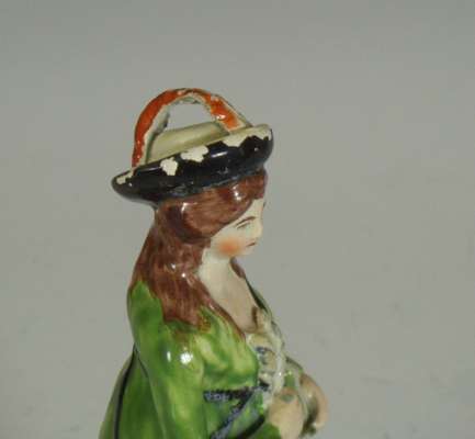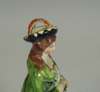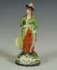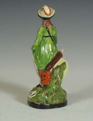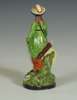 standing wearing a feathered hat, wearing a green coat and black sprigged red dress, clasping a bow and arrow, with a shield and quiver to her back, on a scroll base