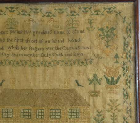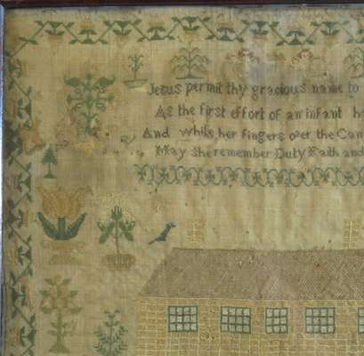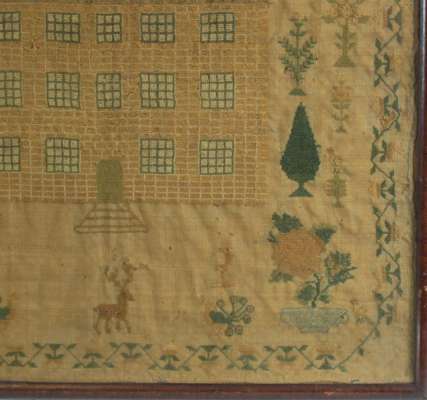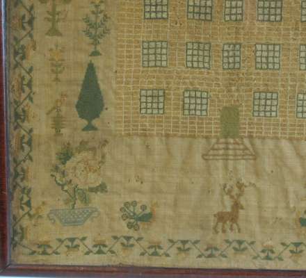 centred by a brick house with birds, animals and foliage, contained within a foliate border