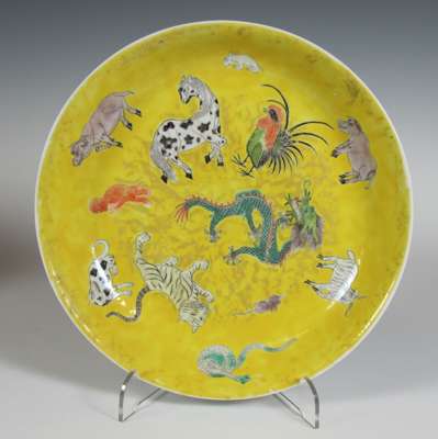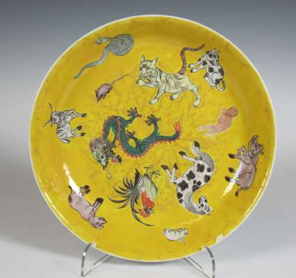 each decorated with twelve animals, comprising: the rat, ox, tiger, hare,dragon, snake, horse, goat, monkey, cockerel, dog and pig, the verso with red seal mark (2)