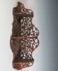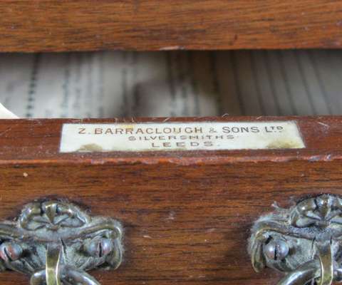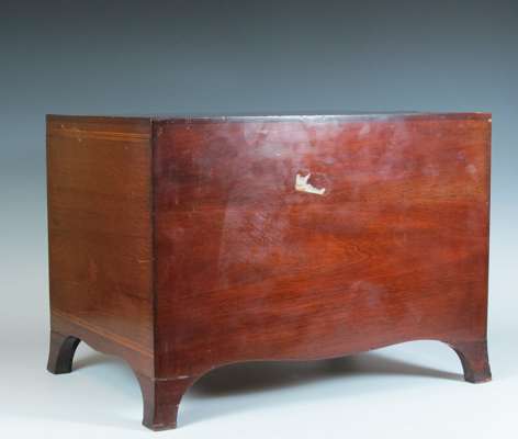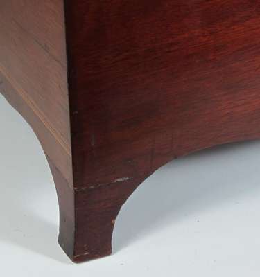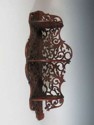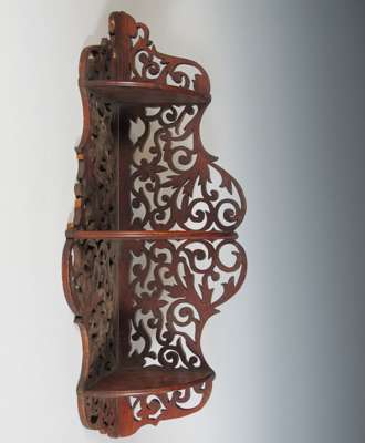 with boxwood and ebony inlay, comprising three graduated drawers on bracket feet, 49cm wide, 36cm high, 34cm deep; and a mahogany corner wall bracket, with three shelves and reticulated sides, 69cm wide (2)