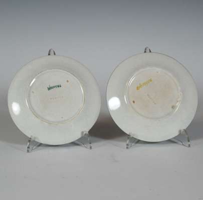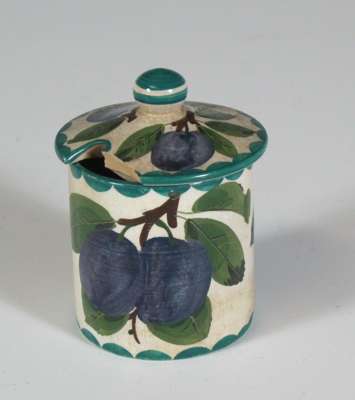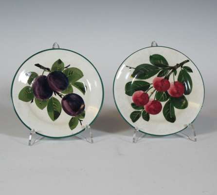each item decorated with cherries, various marks, comprising: a teapot and cover, sugar bowl, milk jug, two cups, two saucers a small dish; and a small Wemyss preserve pot and cover (cover chipped); and a small dish, each decorated with plums, various marks (10)