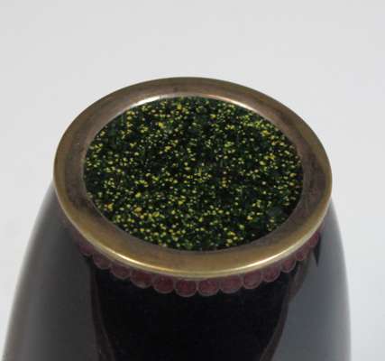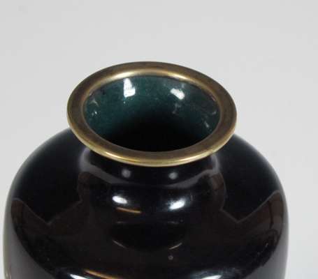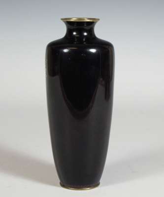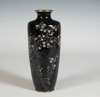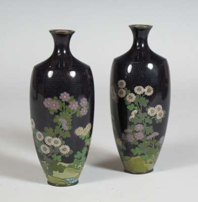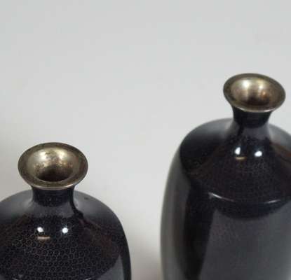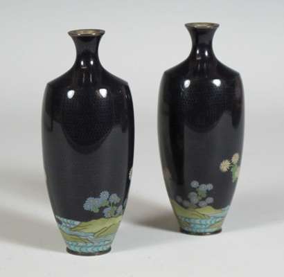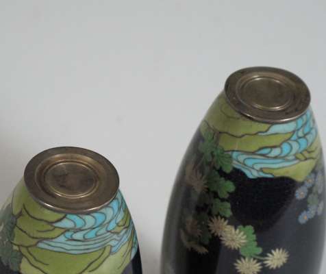 of ovoid tapering form below flared neck, decorated with prunus blossom and a bird on a branch on a dark blue ground, 18cm high; together with a pair of smaller vases of similar form, each decorated with chrysanthemums growing above hills and a river on a dark blue ground with allover spirals, 12.5cm high (3)