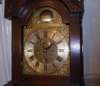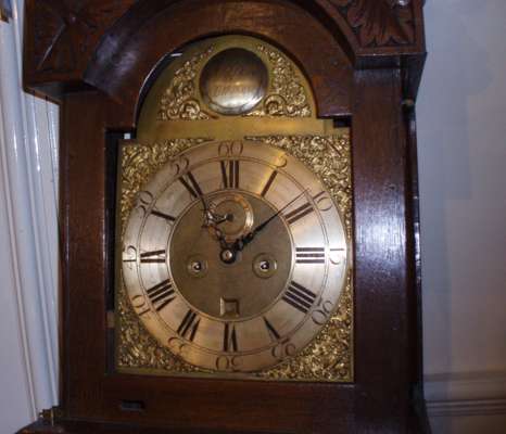 the arched brass plate with silvered dial, cast spandrels, Roman numerals, date aperture, the carved pediment of opposing dogs, oak leaf carved frieze, arched trunk door, plinth base