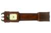 the arched enamel and painted dial depicting a hunting scene, Arabic numerals, subsidiary second dial and date aperture, eight day movement, the swan neck pediment with urn finial, Corinthian columns, crossbanded shell inlay trunk door, crossbanded plinth base, shaped apron, raised on bracket feet