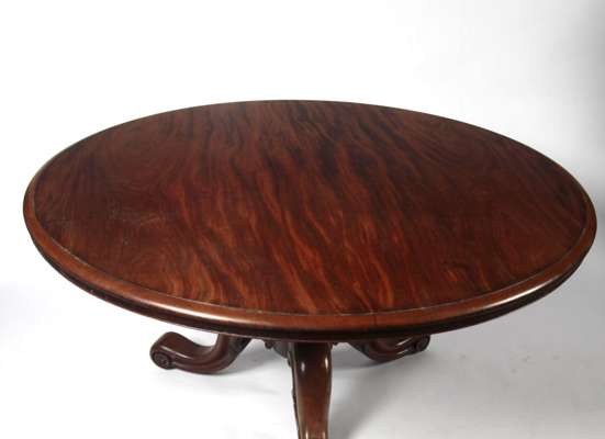 the moulded circular top raised on an onion turned support, carved downswept tripod legs terminating in C-scrolls, with concealed brass castors