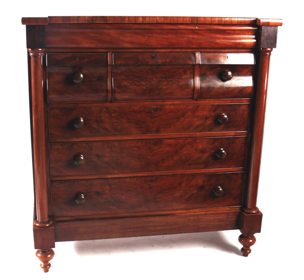 the rectangular top over a concealed ogee frieze drawer, over three deep ogee short drawers, over three graduated long drawers, plinth base, flanked by pilasters, raised on tapering turned feet