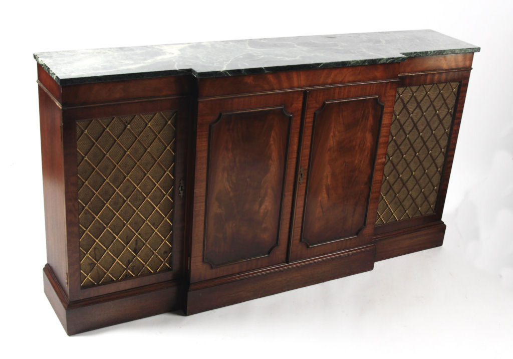 with beaded frieze over two panelled doors flanked by brass mesh doors enclosing shelves, raised on plinth base